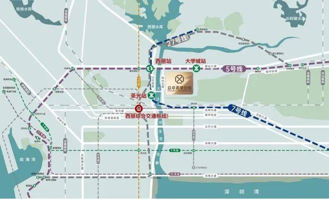 汇聚商业、交通、教育、生态、医疗等城市级资源——西丽、大学城、茶光站等3地铁交汇;周边九班公立幼儿园、九年一贯制南二外平山学校、深圳大学城丽湖实验学校等学府环伺;大沙河文体中心,活力人文运动时光,充盈生活;深圳大学总医院、南方科技大学医院等安一家老幼之心;益田假日里、西丽天虹等拥抱繁华与便利。