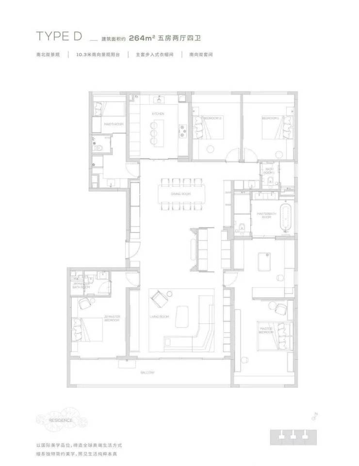 264为五房两厅四卫产品,更细腻的产品设计,超奢华四件套南向主卧,标准南向次主卧, 6.6米巨型方厅,纵向超长LDK一体化空间,专属家政保姆空间,超大容量收纳空间,令居住的尊贵从每处品质细节里流露而出,创造独一无二的奢享体验。