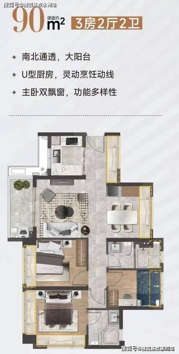 【建面约90㎡奢阔3房】设计的是竖厅南北通透格局,全屋飘窗设计,客餐厅错开布局,主卧双飘窗,U型厨房。
