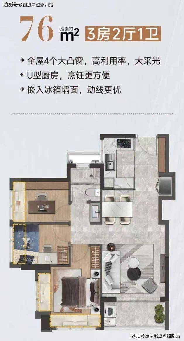 【建面约76㎡精致3房】设计的是竖厅格局,有设计S型冰箱预留位,主卧双飘窗设计,U型厨房,有西北向,西南向,东南朝向。