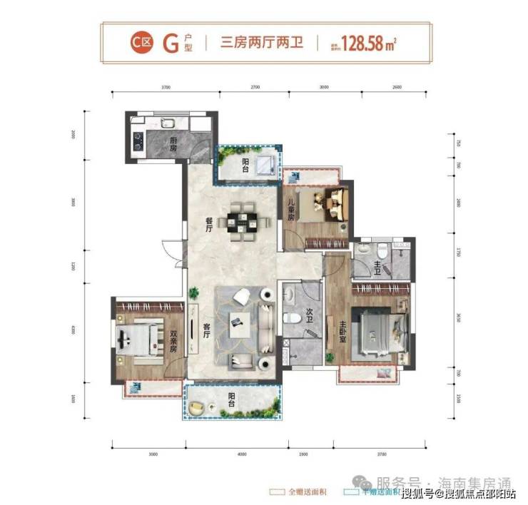 🏖𝐅户型约𝟭𝟬4㎡(三房两厅一卫)