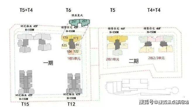 首推一期1栋5单元(45层),91-173㎡3-4房,共232套,以122-175平米4房为主,占比83%,还有两套257平顶复产品。173/257平大户型双电梯独立电梯厅入户,南区91-125平户型3梯4户。