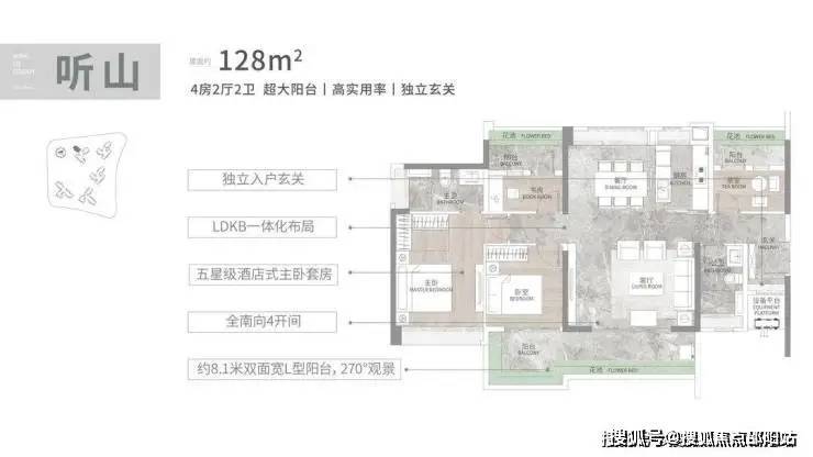 建面 128㎡四房:L 型独立玄关提升归家仪式感,8 米 L 型阳台实现 “观景 + 晾晒” 分区,四开间朝南搭配餐厅全景飘窗,南北对流效果极佳;空间布局均衡,主卧套间与长辈房分离,兼顾私密性与家庭互动,适合二胎家庭。