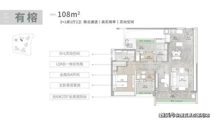 建面 108㎡3+1 房:作为入门级改善户型,四开间朝南,近 6 米南向阳台搭配 270° 景观视野,LDKB 一体化设计打造 5.9 米大方厅,增强家庭成员互动;主卧为奢阔套间,配备南向大飘窗与 L 型衣帽间,额外拓展空间可作书房或儿童房,适合三口之家。