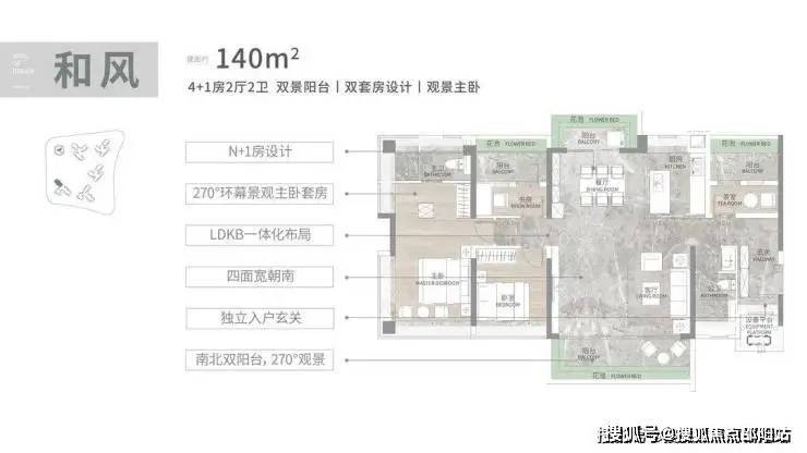 建面 140㎡4+1 房:南向采光面达 15.7 米,南北双阳台保证通风与景观,LDKB 一体化设计让公共空间更显阔绰;主卧配备 270° 折叠屏飘窗,视野开阔,额外拓展空间可定制为家庭影院或健身区,满足高端改善需求。