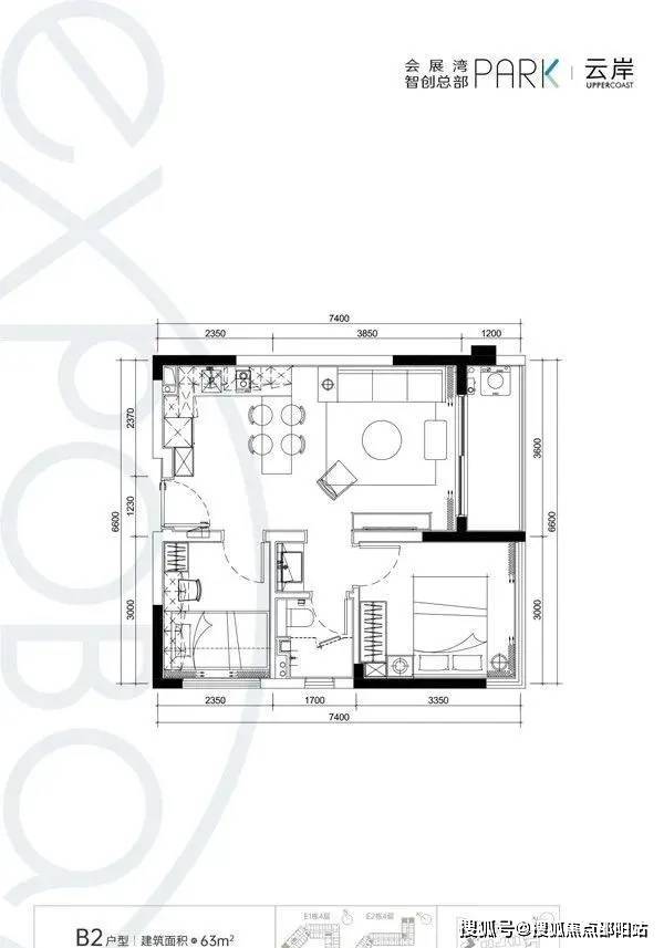 【B2户型:63㎡】房型:两房一厅一卫朝向:E1、E2(西南、东南)户型优势:端头位、双面采光、无敌景观