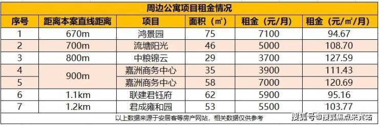 目前距离本项目约700m的45㎡产品的月租金可达5000元,同时周边73㎡产品的月租金可达7000元。