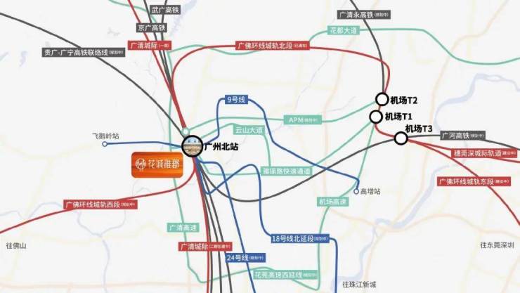 三城轨串联:广清城轨(一期已通车,二期建设中)、穗莞深城轨(在建)、广佛环线;