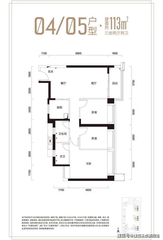 约113平的3房做了两种户型设计,其中,02/03户型,为南向设计。