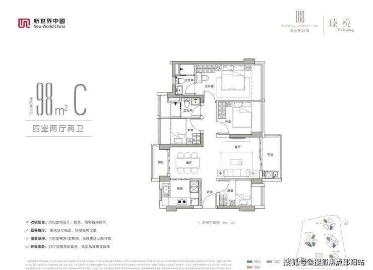 新世界188号·瑧悦,由新世界集团打造,总占地面积约1.91万㎡,总建筑面积约17.94万㎡,计容建筑面积约13.57万㎡,容积率6.37,绿化率40%,共由4栋总高45-49层住宅组成,其中3栋1单元住宅45F,3栋2/3/4单元住宅49F,4栋是一所18班幼儿园,配套有老年人日间照料中心,婴幼儿托育机构。