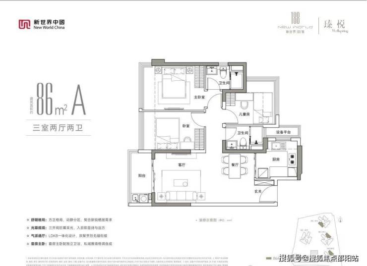 到了建面约86平户型,三房空间更舒适,两个卫生间也可以供改善群体上车,南向三开间采光,西南朝向看园林景观,居住空间更加静谧。