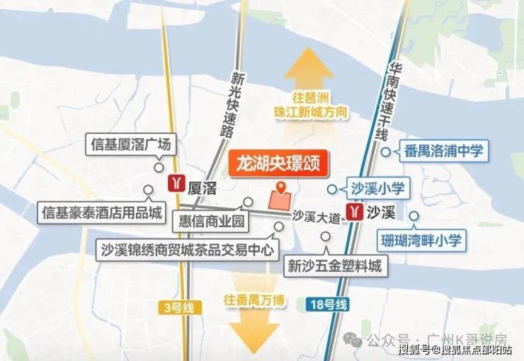距离18号线沙溪地铁站约600-700米,18号线1站万博,2站琶洲,3站珠江新城。