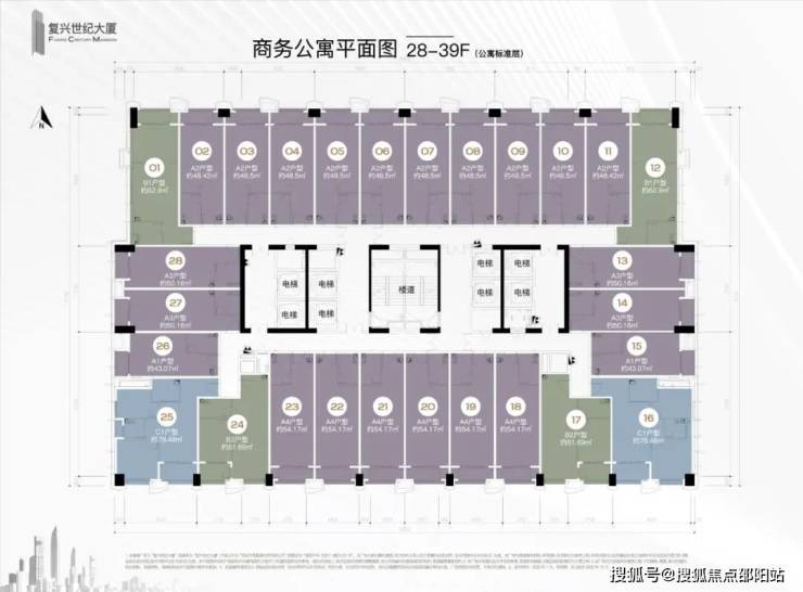 公寓8梯28户,办公6梯15户,商业4梯34户
