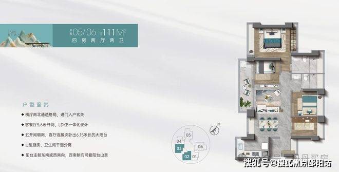 111㎡的4房2厅2卫,设计:南北通透横厅,玄关入户,客餐厅5.6米宽。LDKB一体化,五间朝南。卧室面积:主卧20.6㎡,次卧9.04㎡/8.04㎡/7.15㎡/6㎡(含飘窗)。客厅连次卧阳台5.4米长。U型厨房,卫生间干湿分区,得房率约76%(不含赠送)。阳台东南或西南向,西南向可观山景。