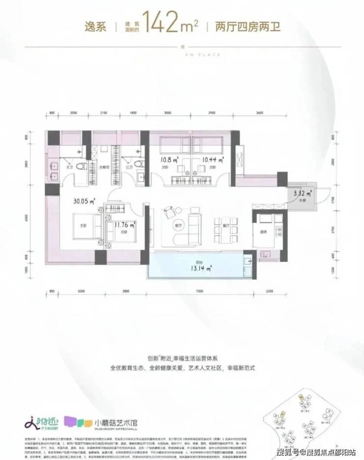 142㎡的4房2厅2卫,1栋2单元05户型/2栋1单元01户型,设计的是横厅南北通透格局,独门独户,赠送约3.32平的入户空间,客餐厅7.3米开间,LDKB一体化设计,五开间朝南,主卧带大衣帽间,分别做到了主卧30.05㎡/次卧11.76㎡/次卧10.8㎡/次卧10.44㎡(包含墙体飘窗),客厅连接餐厅出7.3米长的大阳台约13.14平,U型厨房,卫生间干湿分离,得房率约103.95%(包含赠送),西南或东南朝向。飘窗赠送面积24.12㎡+阳台赠送6.57㎡+外廊赠送3.32㎡=实际赠送34.01㎡。