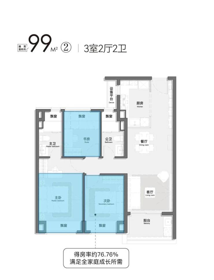 方正合理的真三房布局,做到了得房率约76.76%,在同类近零能耗产品中,一般项目只有不到72%。同样的面积段,不仅仅是数字上高出了4%,而是空间尺度感更强,居住感受更加宽敞舒适。
