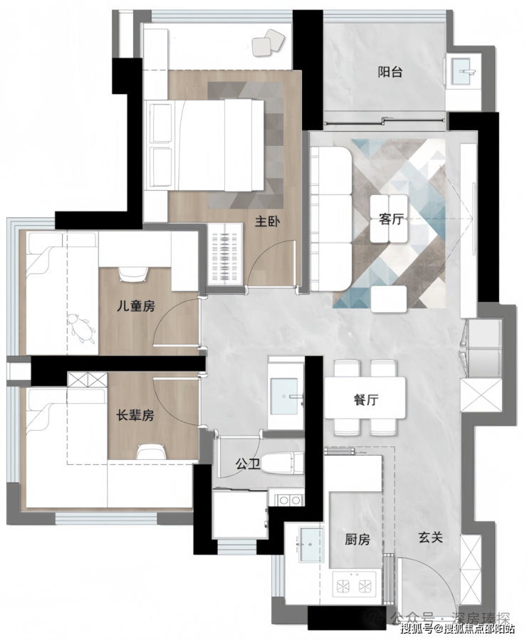 产品方面是项目最大的亮点,主推建面约69-106㎡的三至四房,作为深圳建筑新规后的产品,得房率据称可达100%左右-1-4。其中69㎡户型做到三房一卫,在深圳新房市场中堪称稀缺——客厅直出阳台,厨房靠近玄关动线短,卧室集中一侧动静分区清晰,没有暗房,麻雀虽小五脏俱全-1-6。89㎡三房两卫有竖厅和横厅两种选择,三开间朝南,双卧配备270°飘窗;106㎡四房两卫南北通透,大阳台设计,四开间采光-4。这种“小面积、多房间、高得房率”的产品策略,精准锚定预算有限但追求多房间功能的年轻刚需家庭。