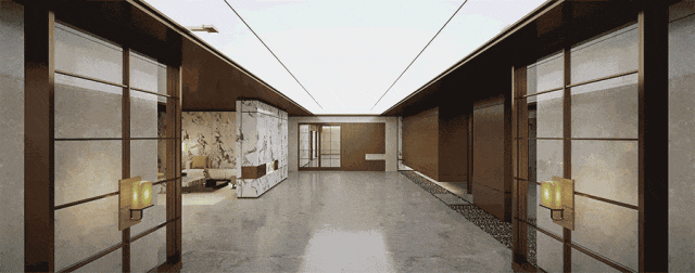 一楼大堂整面“宝格丽大理石”的铺陈,与“屏风”元素互为对话,一目沉醉沉浸东方雅韵之魅与奢品生活之贵;水墨黑白纹理的大理石前台与灰质水墨大理石的互动加持了国际腔调的酒店式礼仪气场;11.6米的挑高舒展了业主的气度。▽