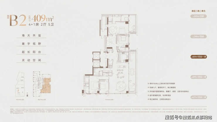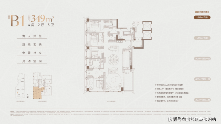 高区(42-58 层,150–200 米):370–403㎡ 4+1 房五卫(家族型)