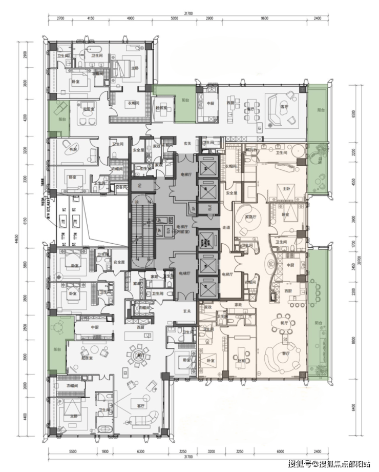 主力370–375㎡与403㎡:标配独立家庭厅 + 完整家政套间 + 保姆梯;西南 / 东南双面采光,270° 转角视野;厨房分中厨(专业封闭)+ 西厨(社交开放),可选嘉格纳/ 方太双厨电品牌;部分户型带 X 可变空间,可做茶室 / 书房 / 收藏室。
