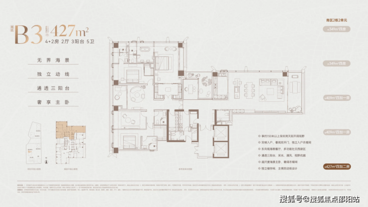 低区(5-42层)主打216-306㎡四房产品,入门级216㎡四房两厅三卫,以超92%的实用率、无次梁设计,为精英家庭提供灵活的居住布局;269㎡户型配备独立家政套间,12.5米超长阳台联动7米大开间客厅,兼顾实用性与观景体验;304㎡低区顶配则实现私梯入户,主人与服务动线完全分离,15米巨幕阳台直看深圳湾,将海景资源最大化利用。