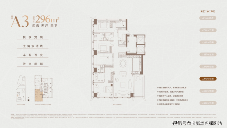 216㎡四房两厅三卫:入门顶豪,四房功能齐全,无保姆间,适合精英家庭;客厅 + 东向大阳台联动,阳台进深约 2.4 米;92%+ 实用率,框架核心筒无次梁,可微调布局。