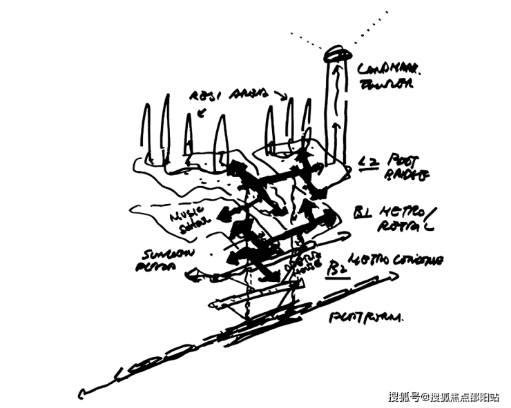 △ 效果图:地铁口无缝衔接下沉广场 ©Farrells
