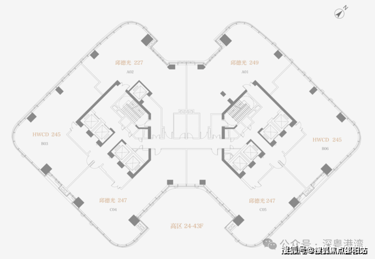 方胜纹双核心筒的设计使得整栋建筑更加高效和私密,并实现了双专梯电梯入户,为塔尖人群高效的工作和私密的生活而服务。转角处曲线设计,拓宽了整个建筑界面,使得建筑拥有270°转角无柱开放式观景视野。是塔尖人群拥揽深港的极佳观景台,足以盛放您帷幄城市的雄心。