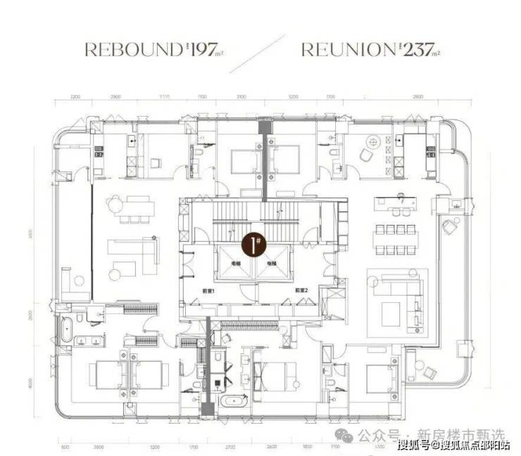 项目由4栋住宅和1栋幼儿园组成,共261套。首推1栋,42套,2梯2户,建面约197-235㎡四房大平层住宅。