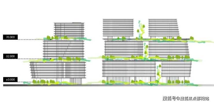 构建多重空中垂直绿化,创建更多的非正式办公场所,随性自由透气的氛围,提供更多的即兴交流场所,建设独有的空中观景平台,体会阳光、海风、森林、氧气的现代化新型办公场所。