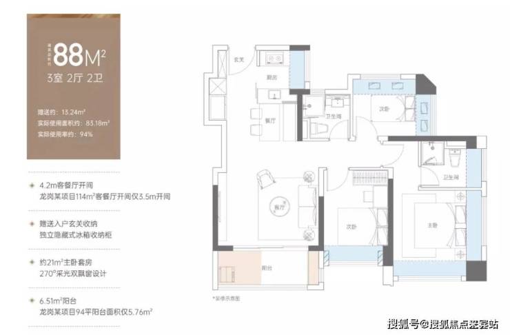 88㎡的客厅开间做到约4.2米,堪比市面上100多㎡的户型,整个空间通透宽敞。