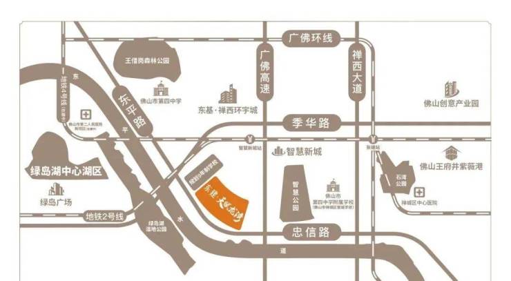 • 两横三纵立体交通,全维路网:两横:季华路、魁奇路 三纵:广佛高速、佛山大道、禅西大道。