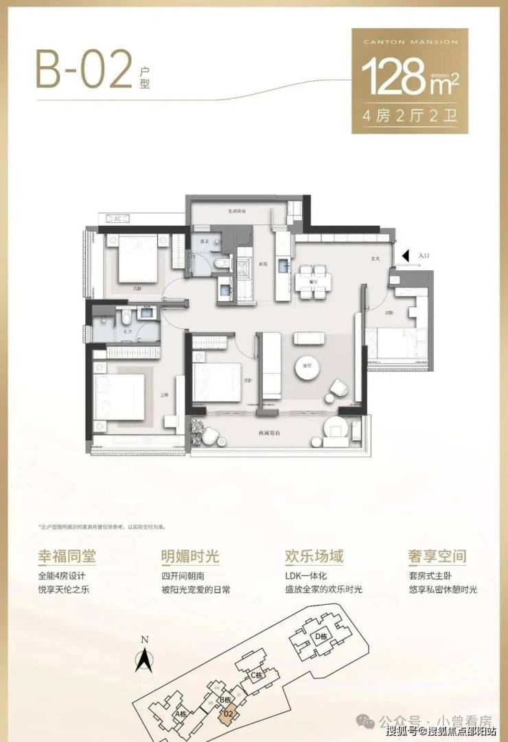 项目在售的B座建面约84-128㎡三四房,三梯四户。