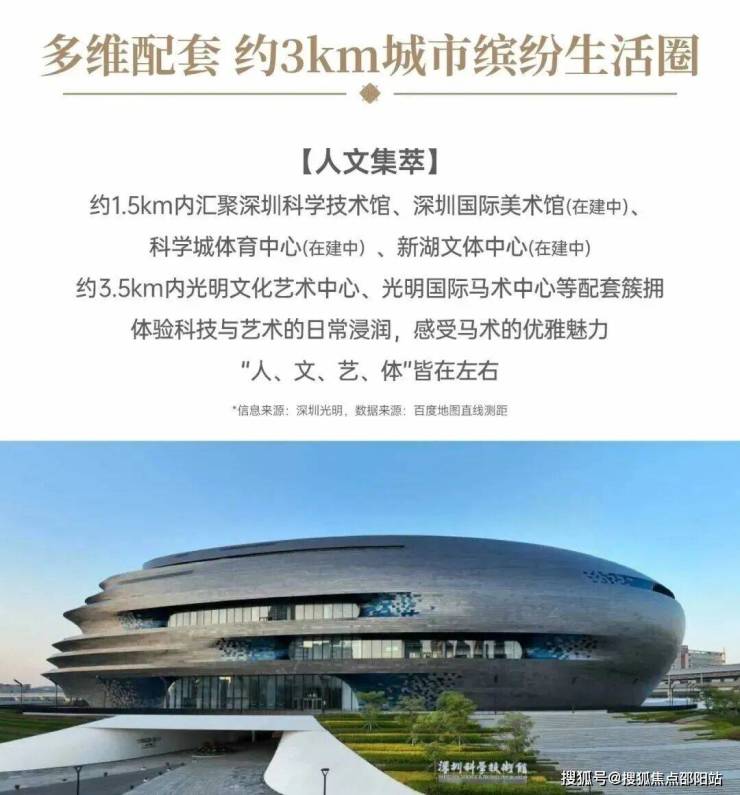其他配套:约1.5km内汇聚深圳科学技术馆、深圳国际美术馆(在建中)、科学城体育中心(在建中)、新湖文体中心(在建中),约3.5KM内光明文化艺术中心、光明国际马术中心等配套簇拥。体验科技与艺术的日常浸润,感受马术的优雅魅力,“人、文、艺、体”皆在左右。