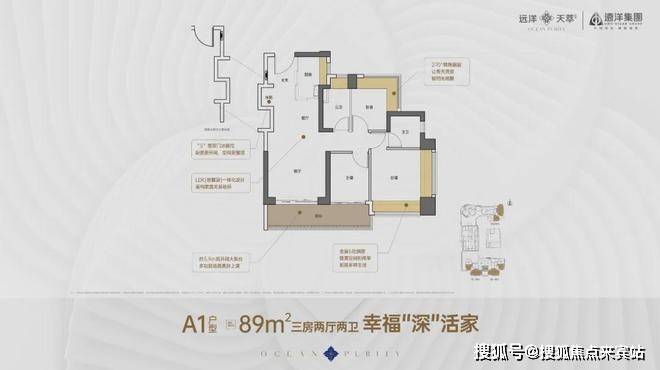 89㎡的3房2厅2卫,A1户型,设计的是竖厅格局,客厅3.5米开间,LDKB一体化,S墙设计预留冰箱卡槽位,客厅连接次卧出5.9米长的大阳台,主卧双面飘窗,次卧270度转角飘窗,U型厨房,卫生间干湿分离,得房率约72.57%(不含赠送),阳台有朝西向、东向、南向。