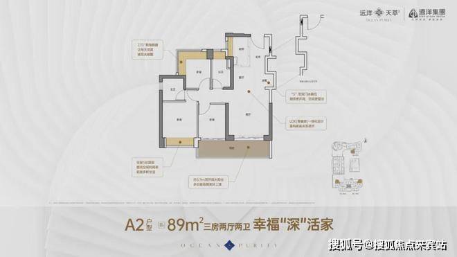 89㎡的3房2厅2卫,A2户型,设计的是竖厅格局,客厅3.5米开间,LDKB一体化,S墙设计预留冰箱卡槽位,客厅连接次卧出5.9米长的大阳台,次卧270度转角飘窗,U型厨房,卫生间干湿分离,得房率约95%(含赠送),阳台有朝西向、东向、南向。