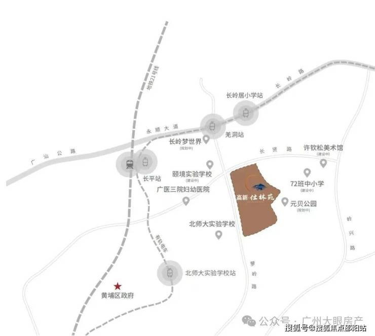 直线距离约800米地铁21号线长平站(走路大概1.1公里),1站黄埔区府(水西站),2站万达广场(苏元站),5站到天河(天河智慧城站);