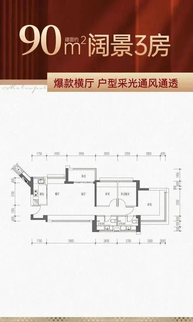 90㎡的3房2厅2卫,是横厅南北通透格局,客餐厅5.9米开间,LDKB一体化,四开间朝南,3个卧室分别做到了主卧12.95㎡/次卧8.75㎡/次卧7.75㎡(包含墙体飘窗),L型厨房,卫生间干湿分离,得房率约77%(不含赠送),阳台主朝东北或西北向。