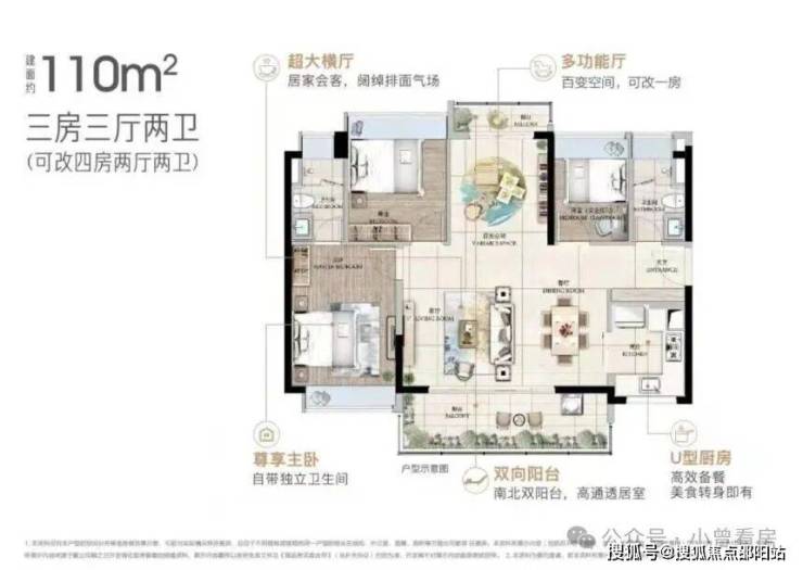 92㎡三房两厅两卫分布在 4 栋期房的 3-28 层,带装修交付,单价 2.6-3.05 万 /㎡,总价约 234 万起,采用 U 型厨房设计,预留双开门冰箱位置,生活阳台与观景阳台分开,家务和休闲互不干扰。