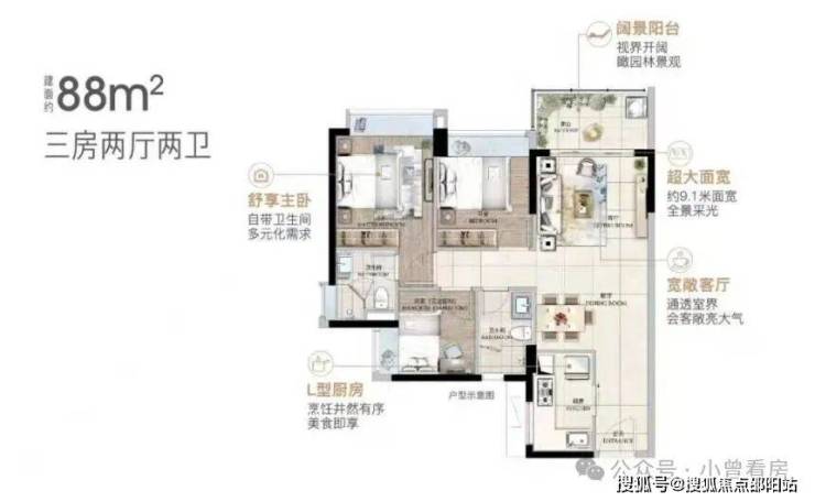 88㎡三房两厅两卫是刚需主力户型,集中在 1-3 栋现房的 5-30 层,总价 199 万 - 228 万,北向毛坯房 199 万起,南向带装修房 228 万起,户型南北通透,客厅连接 3.6 米宽阳台,主卧带飘窗台,收纳空间充足,适合新婚夫妻或首置家庭。