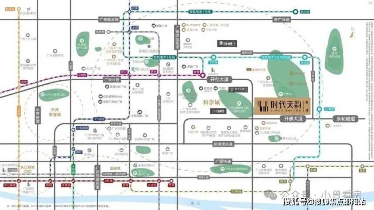 黄埔科学城作为广州向东发展的核心板块,随着地铁 7 号线二期的全线贯通,周边住宅项目的通勤优势进一步凸显,时代天韵(黄埔)便坐落于此,具体位置在开源大道北侧、玉岩路西侧,是板块内当前在售的成熟大盘之一。
