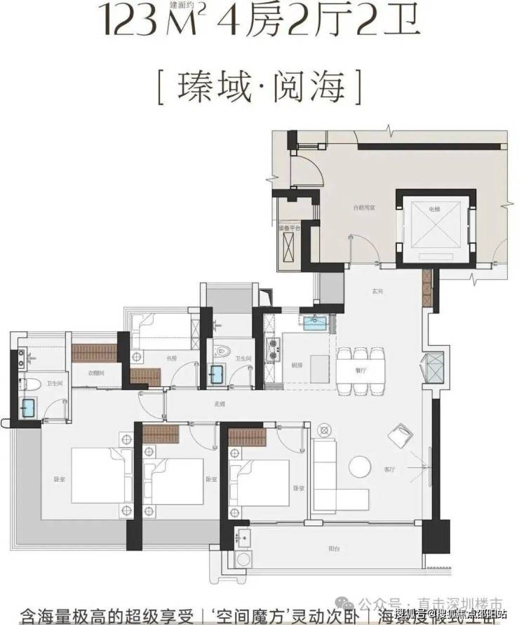 建面约123㎡4房户型,西南朝向,看海和学校景观。四开间朝南,约17.8米超宽景观面,享受IMAX观景视野。赠送的入户空间可以做成入户花园或者储物空间。