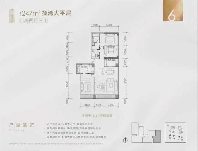6栋望江公寓,总高43层,15、30楼是避难层,24年6月交,中区(16~29层:206、232、261㎡,5梯4户);低区(3~14层:98、146、143、151、161 ㎡,3梯7户,在售10、11楼)