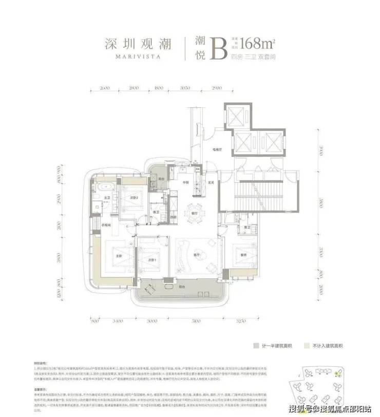 建面约168㎡的户型:四房三卫双套间