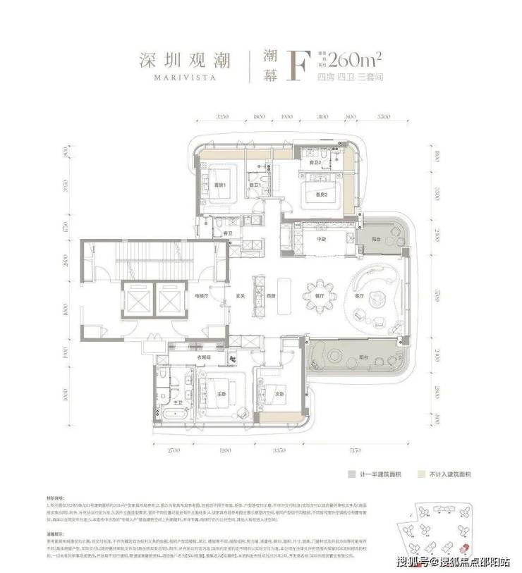 建面约260㎡的户型:四房四卫三套间
