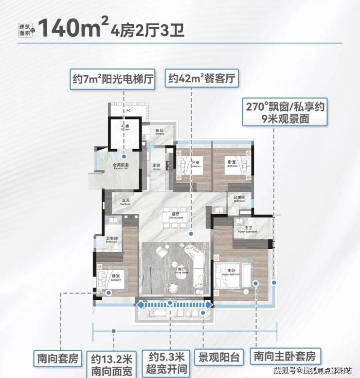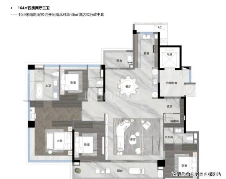 建面164平四房三卫,约16.9米南向采光面,四开间朝南,算是个飞机户型,36平的大主卧。