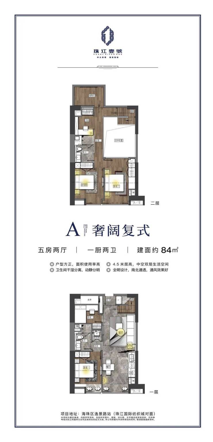 84㎡户型全明设计,南北通透,通风效果俱佳;而且毫不拥挤,4.5米挑高的客厅,让空间充满奢华感,能享受到普通住宅140㎡以上才能达到的产品功能,市场上实属罕见,非常适合二胎或三代同堂的家庭居住。
