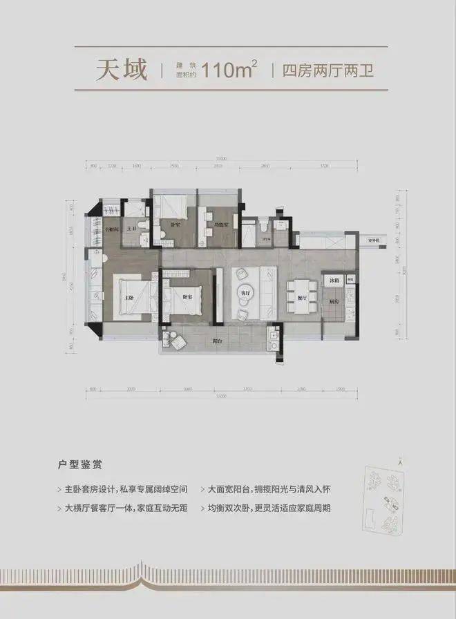 建面约110㎡的四房两厅两卫,南北通透的横厅户型设计,6.7m长的大阳台,客餐厅6m开间;这个横厅户型空间使用率最高,而且飘窗最多。