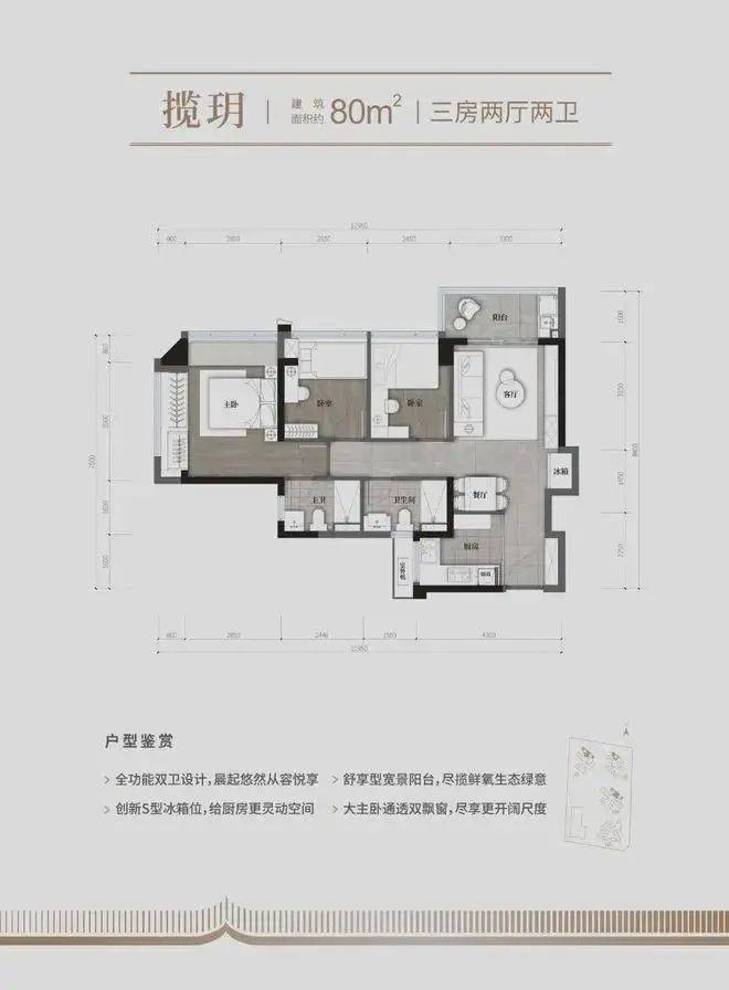 其中最小的户型,80平方米的空间设计出了3房2卫的户型,而89平方米的户型更是令人惊叹,居然带有一个长达6.3米的超级大阳台。