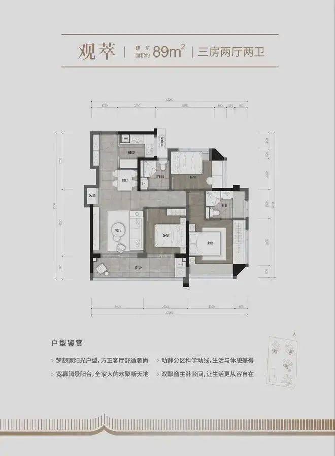 建面约89㎡的三房两厅两卫,竟然做到了带6.3m超级大阳台!三个房间也比市面上89㎡的户型要大。